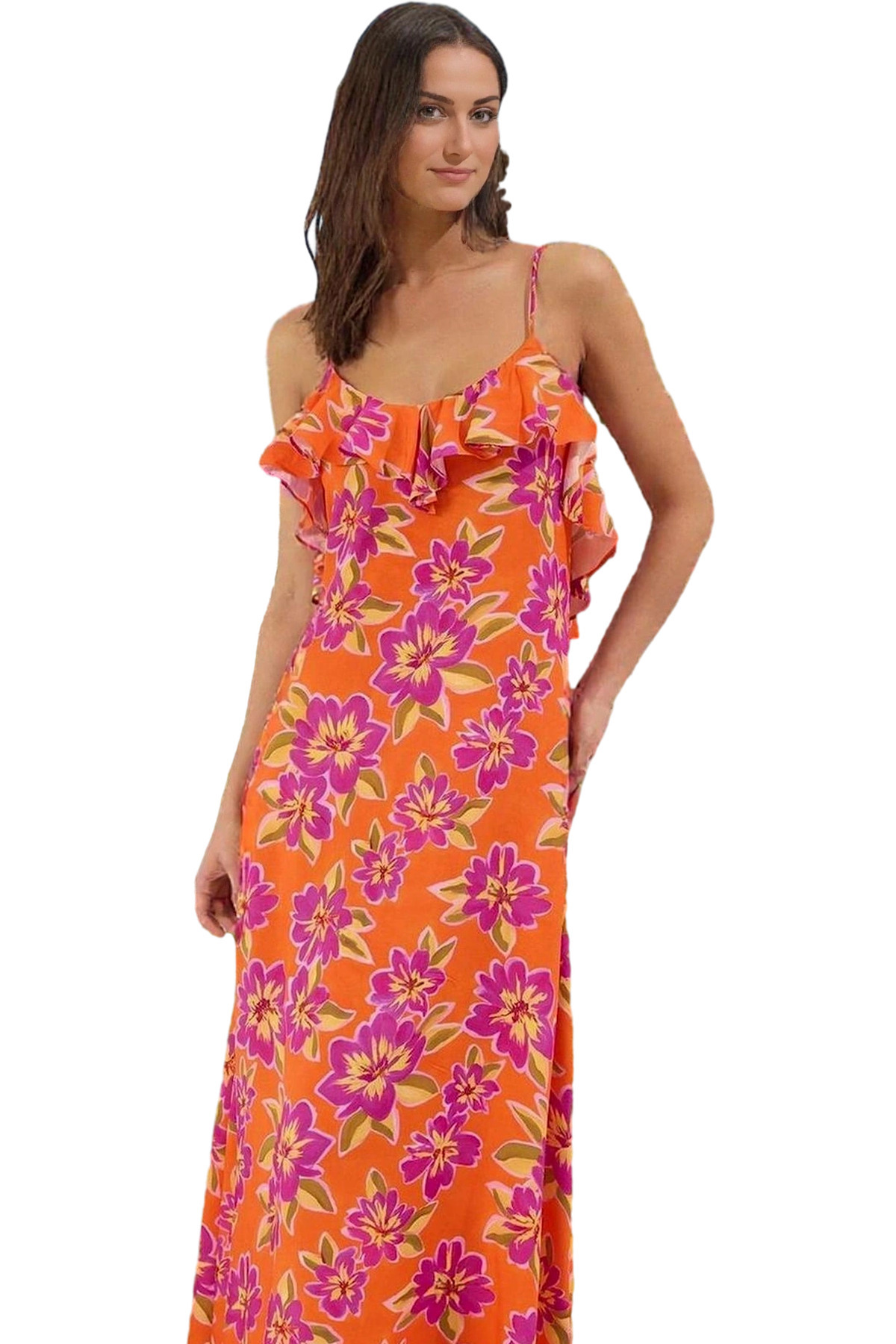 Kadın Maxi Viskoz Dokuma Plaj Elbisesi Volanlı V Yaka Shift Yazlık Yaz Aylarının Vazgeçilmezi