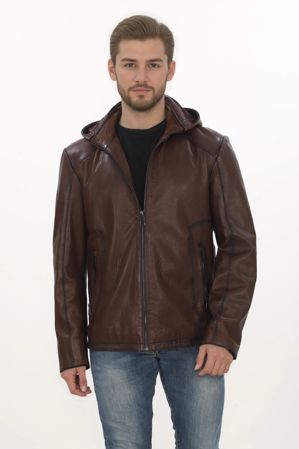 Erkek El Yapımı Kapüşonlu Derimont Kahverengi Hakiki Kuzu Derisi Erkek Mont