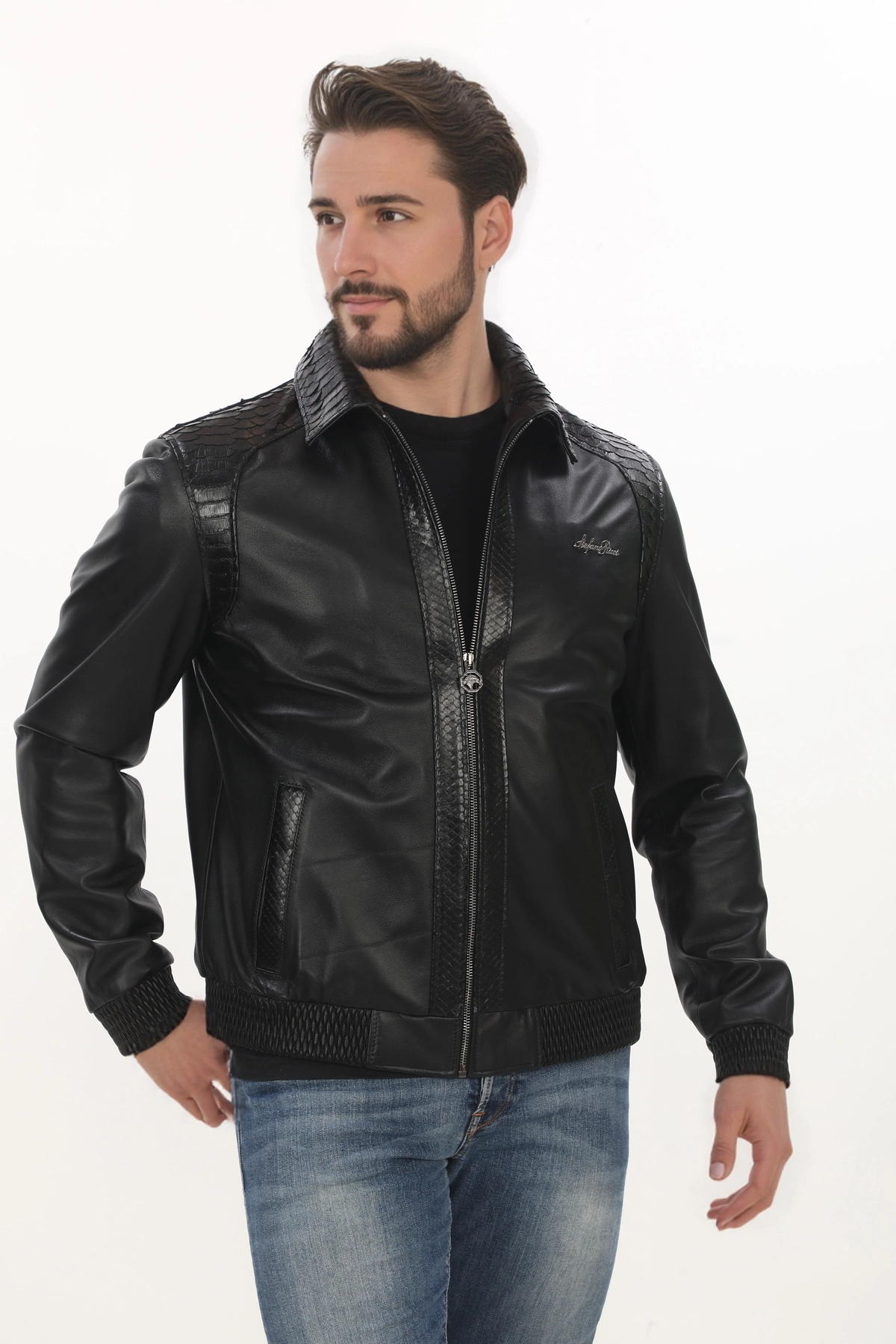 Erkek Dikkat Çekici Derimont Bomber Hakiki Kuzu Derisi Mont Fermuarlı Yılan Desenli