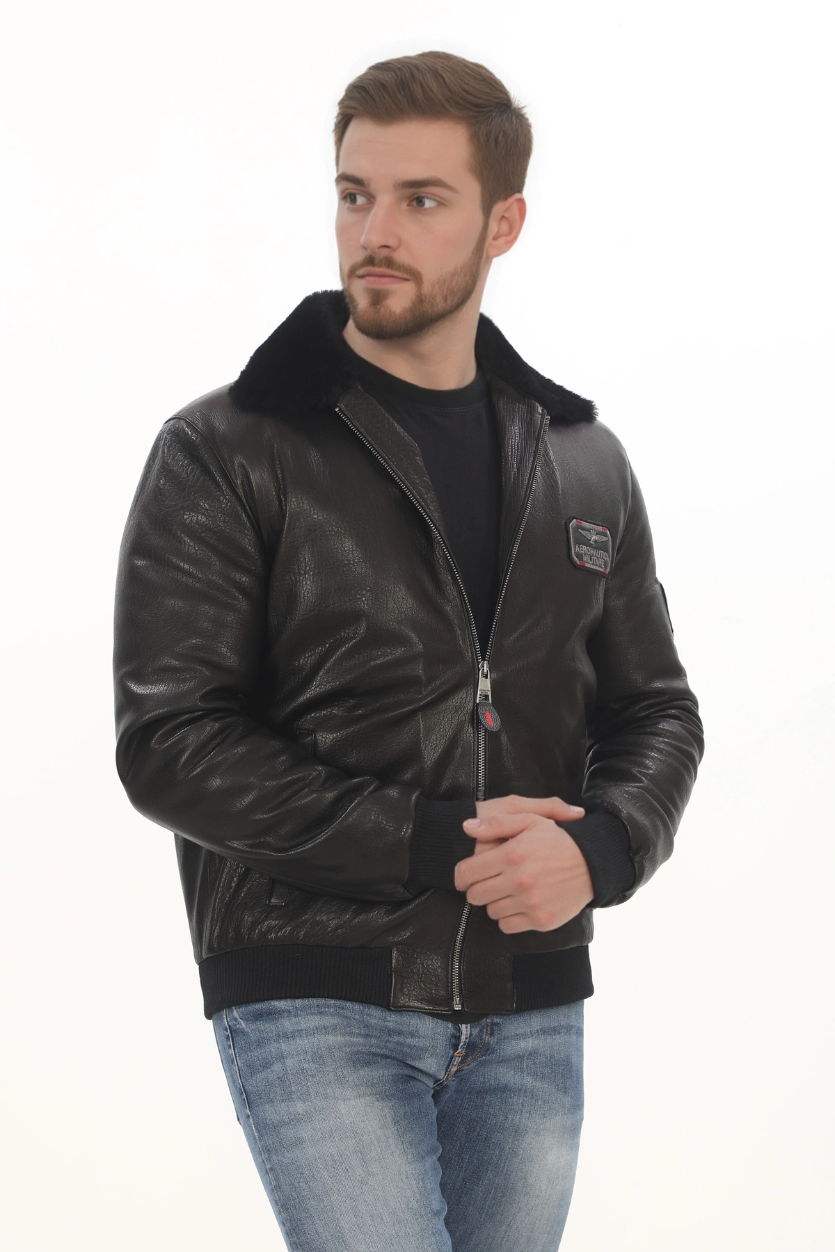 Erkek Hakiki Kuzu Derisi Bomber Ceket Siyah Fermuarlı Kürklü Yaka Mont Kışlık Deri Pilot Dış Giyim