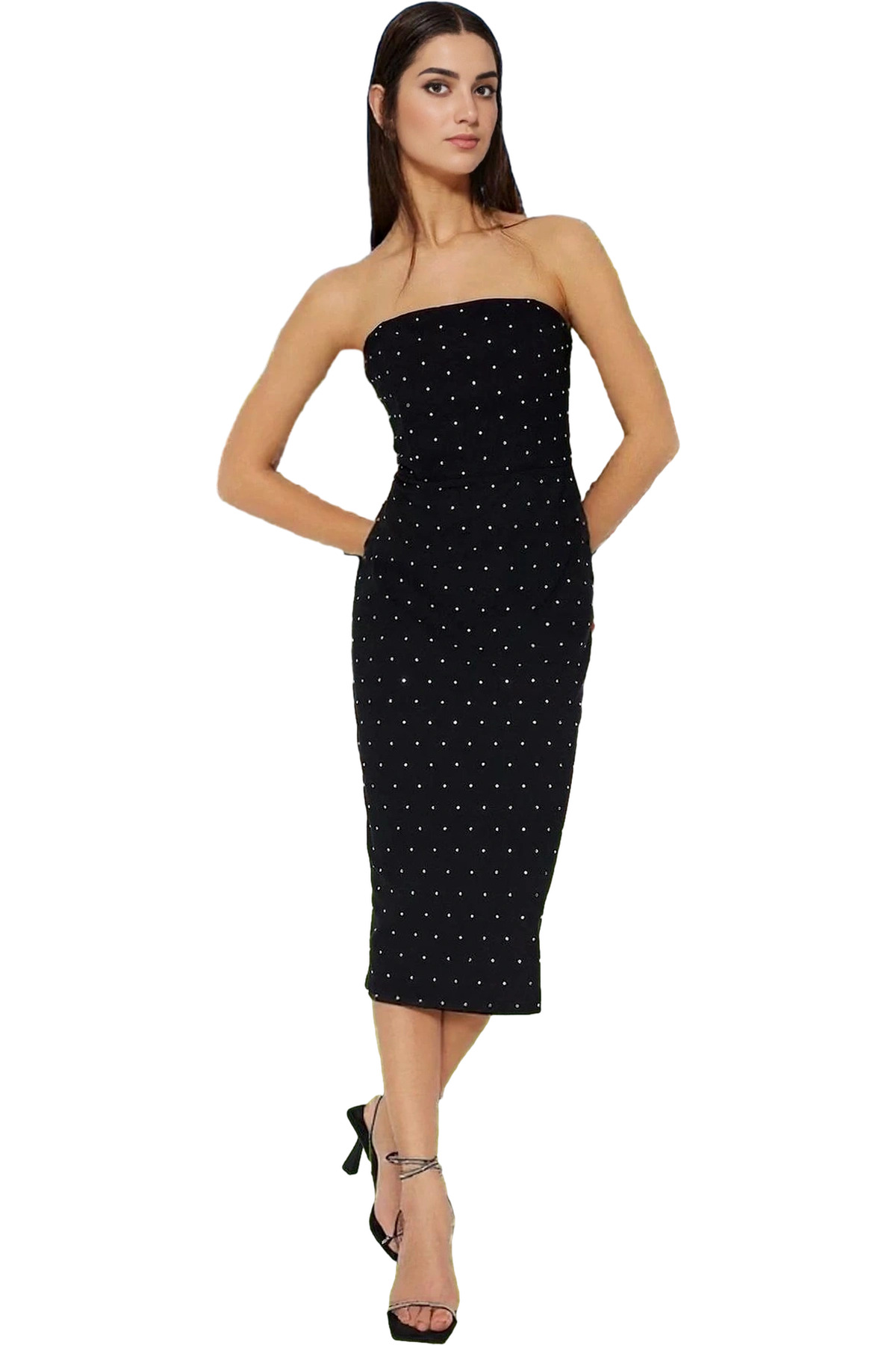 Kadın Midi Boy Straplez Abiye Elbise Finike Dokuma Taş Detaylı Özel Günler İçin Günlük Kullanım