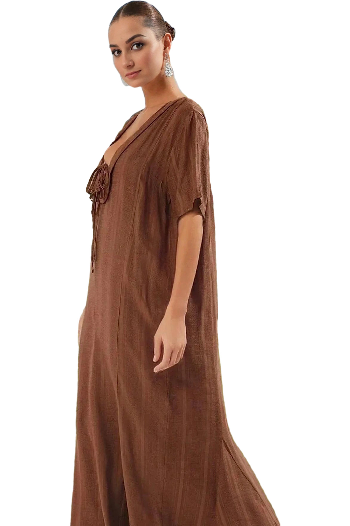 Kadın Maxi Keten Görünümlü Bağlamalı Plaj Elbisesi Yazlık Rahat Tesettür Stil Günlük Kullanım
