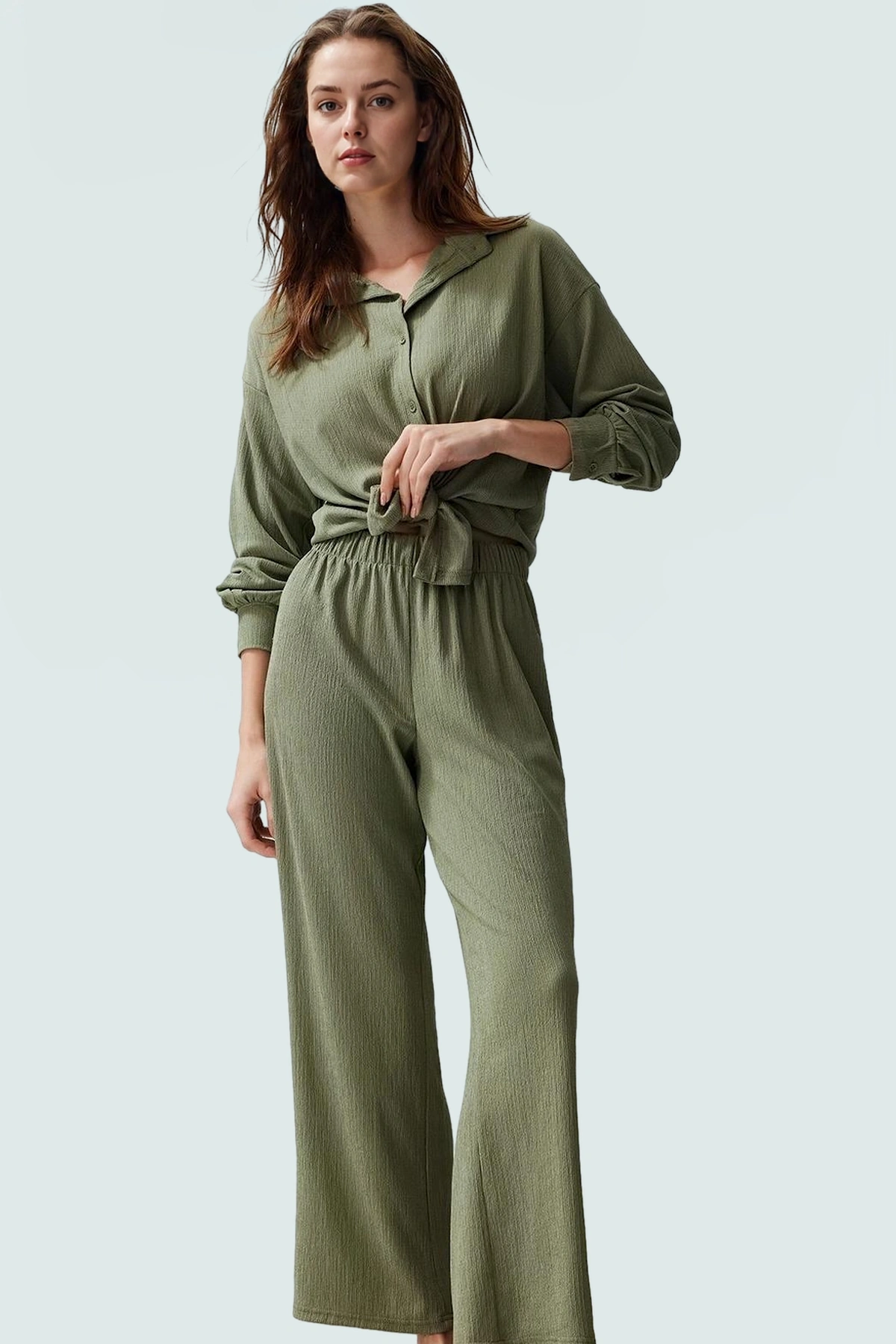 Kadın Keten Görünümlü Bağlamalı Bluz Ve Geniş Paça Pantolon Takım Konforlu Kesim Seçkin Malzeme
