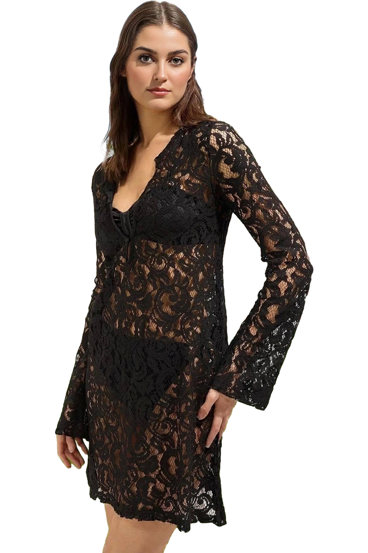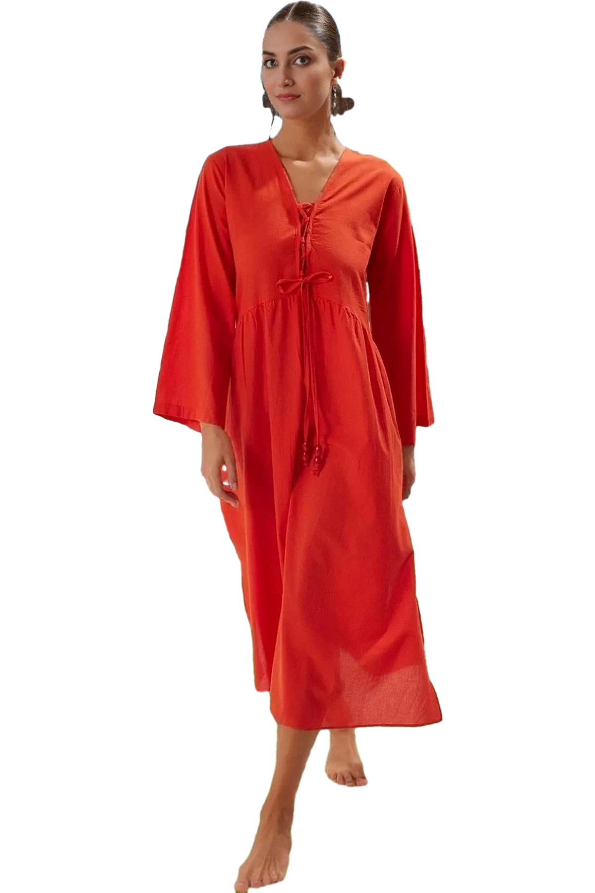 Kadın Maxi Plaj Elbisesi V Yaka Volan Detaylı Pamuklu Rahat Yazlık Yaz Aylarının Vazgeçilmezi