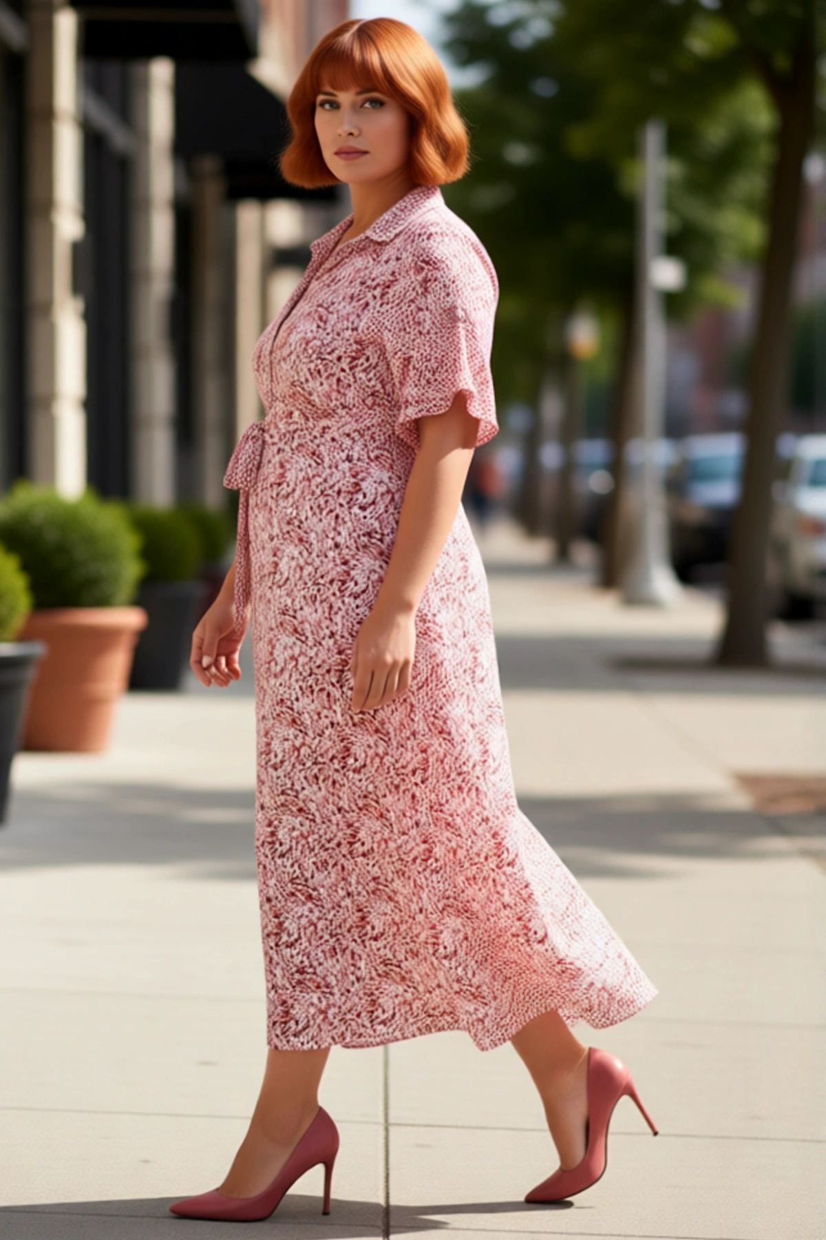Kadın A Line Kuşaklı Maxi Boy Gömlek Yaka Kısa Melek Kol Soyut Desenli Viskon Elbise İlkbahar Yaz