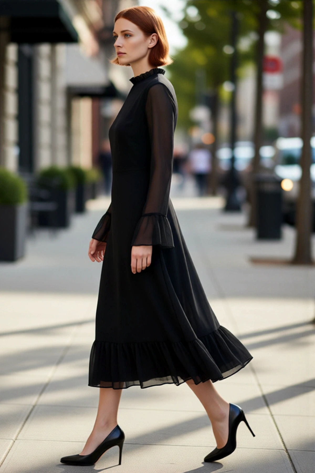 Kadın Şal Desenli Midi Şifon Skater Elbise Balon Uzun Kollu Anahtar Deliği Yakalı Astarlı Kışlık