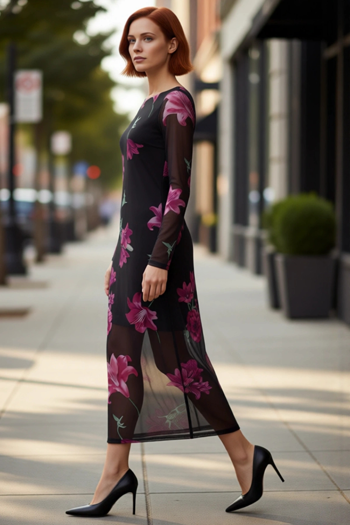 Kadın Vücuda Oturan Astarlı Tül Midi Elbise Uzun Kollu Bisiklet Yaka Çiçek Desenli Şık Ve Rahat