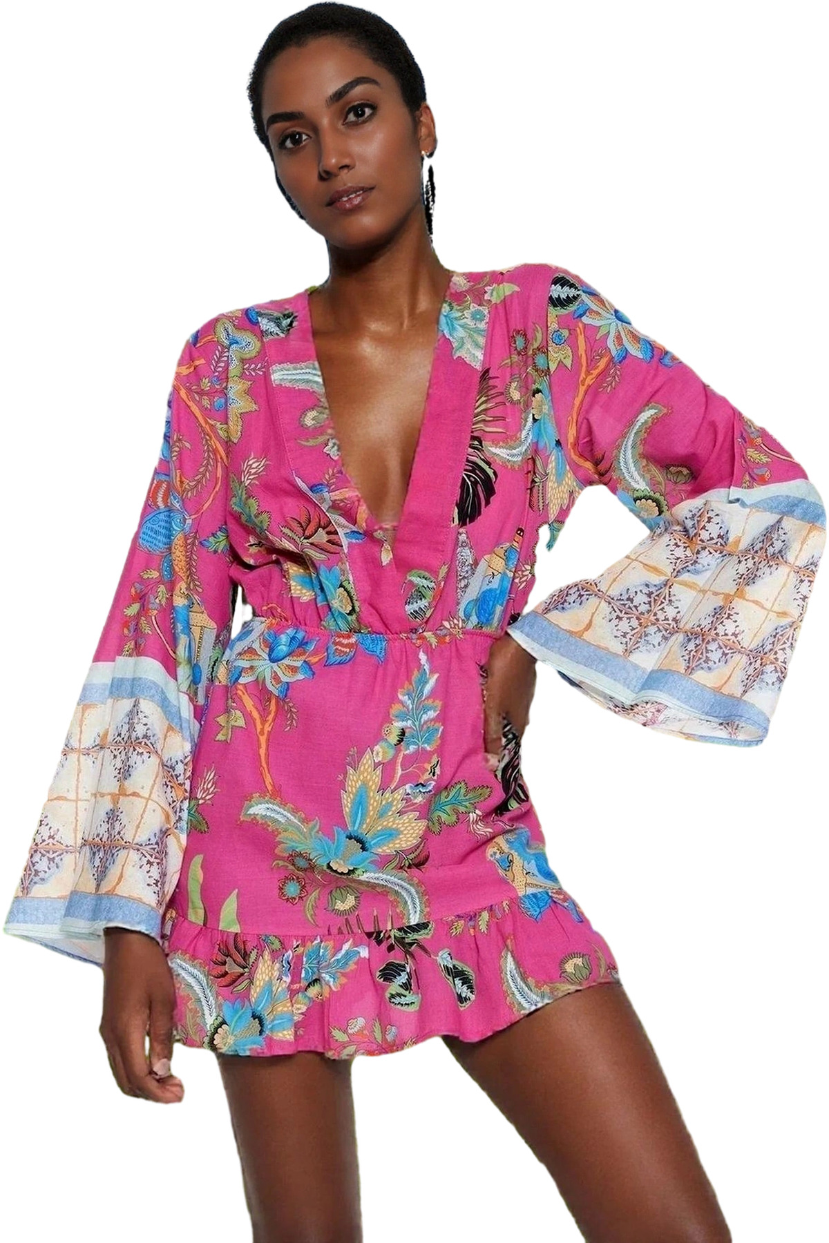 Kadın Çiçekli Mini Elbise Astarlı Kısa Kollu Dik Yaka Yazlık Günlük Yaz Aylarının Vazgeçilmezi