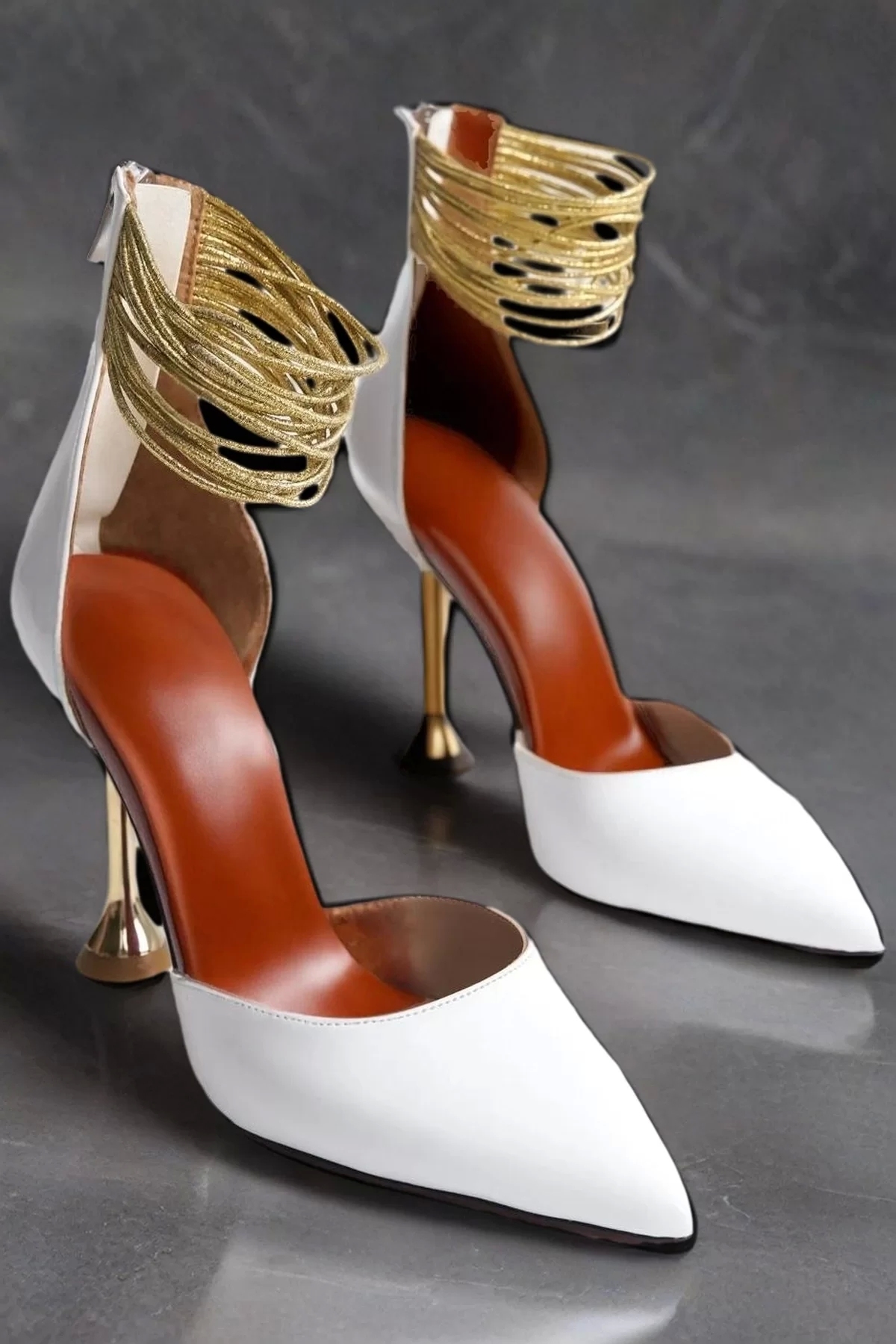 Kadın Altın Bileklikli Çan Topuklu Ayakkabı Sivri Burun Abiye Ayakkabı