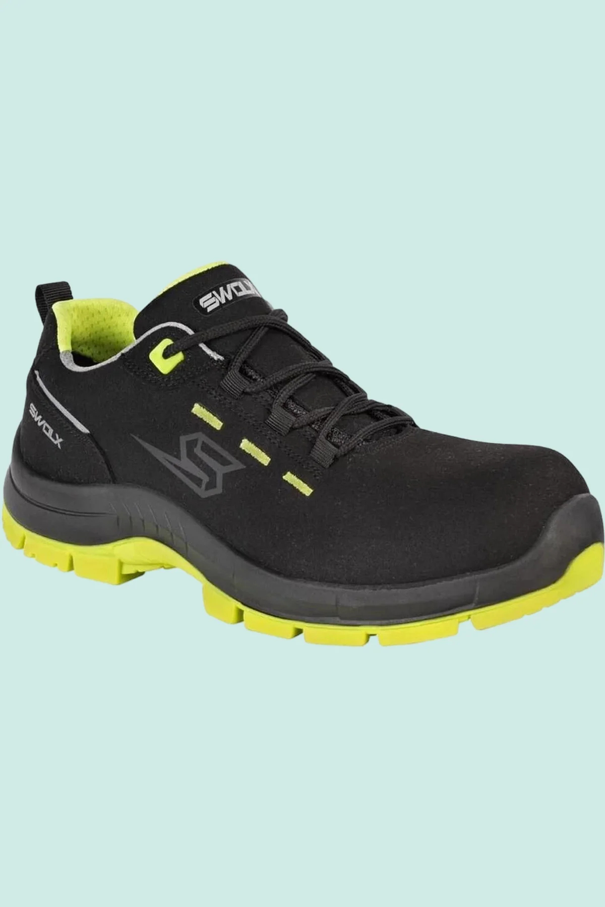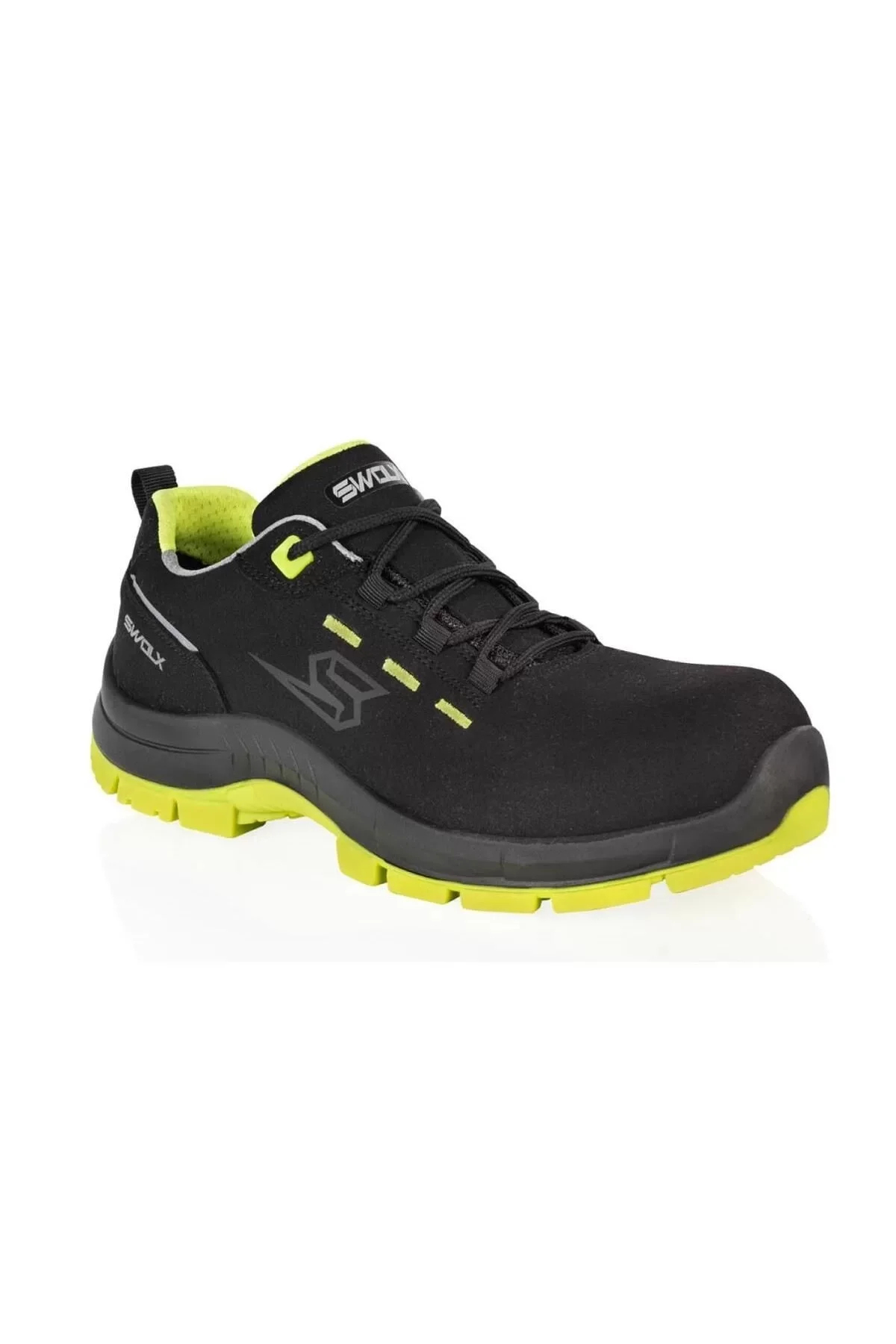 Swolx marka, siyah ve neon yeşil renk kombinasyonuna sahip, iş güvenliği standartlarını karşılayan modern bir ayakkabı modeli.
