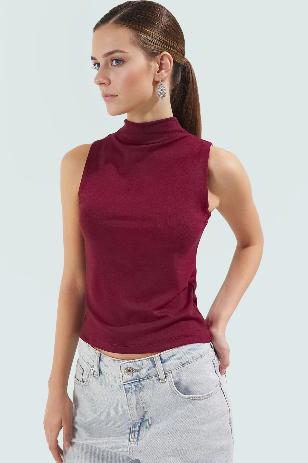 Dik Yaka Kolsuz Fitted Örme Bluz Günlük Şıklık Seçkin Malzeme Profesyonel Görünüm