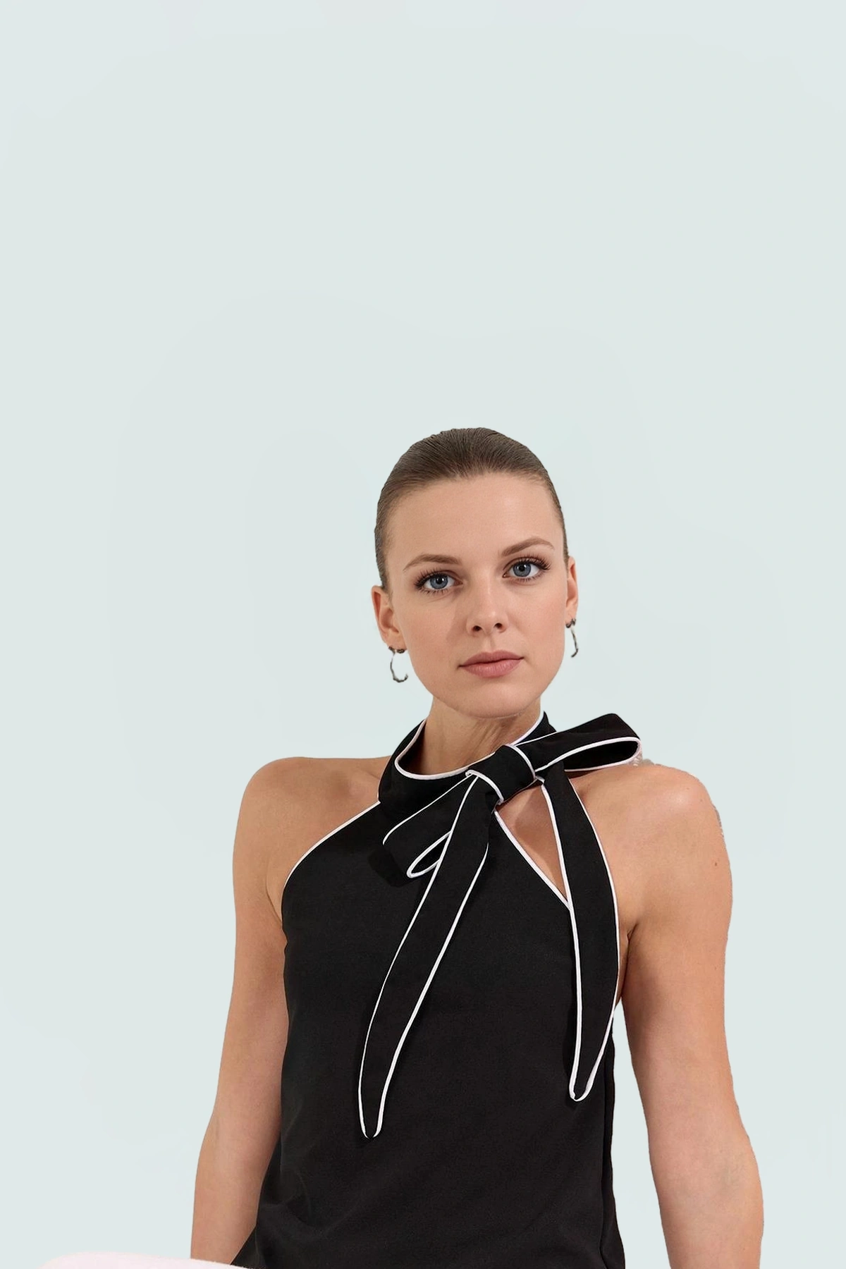Şık Halter Yaka Bluz Kontrast Biye Detaylı Yazlık Rahat Ve Kullanım Zarifane Tasarım